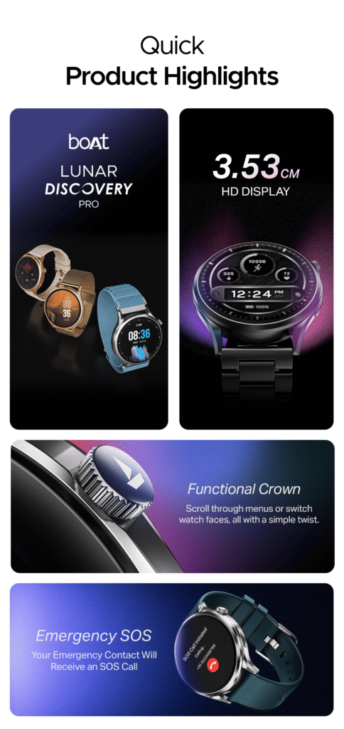 The boAt Lunar Discovery Pro Smartwatch is a budget-friendly smartwatch designed for daily use, fitness tracking, and Bluetooth calling. It comes with a large HD display and health monitoring features, and multiple sports modes and making it suitable for both fitness enthusiasts and casual users.