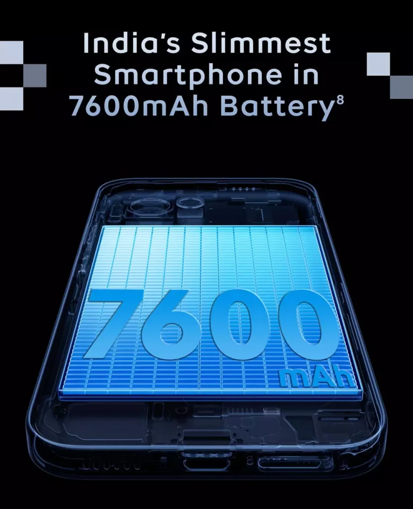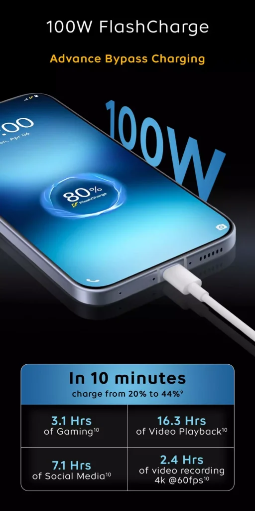 Battery: 7600 mAh huge battery with 100 W fast charging and bypass charging support – excellent for multidays uses and long gaming sessions.