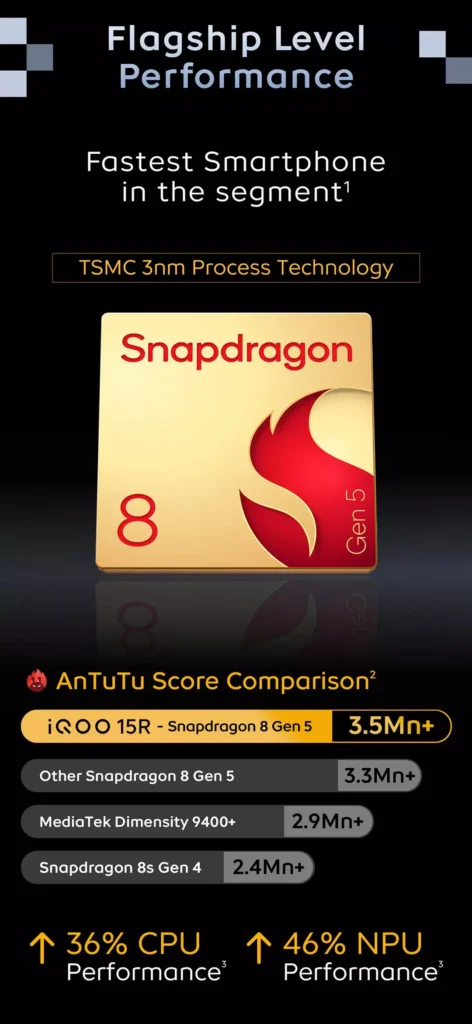 The iQOO 15r aims to offer flagship chipset performance, very massive battery life, and strong gaming